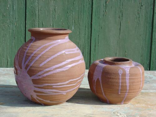 roter Scherben, innen opak glasiert, außen partiell fliederfarben glasiert. H 21 und 12,5 cm