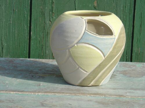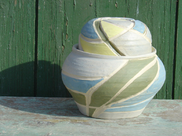 heller Scherben, reliefiert mit Engoben, innen transparent glasiert. H 16 cm