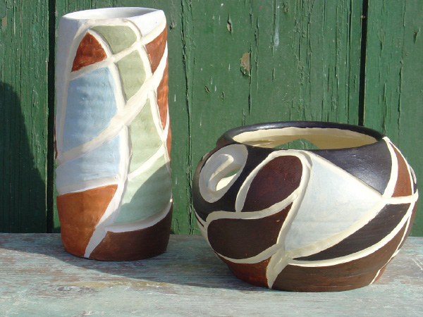heller Scherben, reliefiert mit Engoben, innen transparent glasiert. H 21 und 11,5 cm